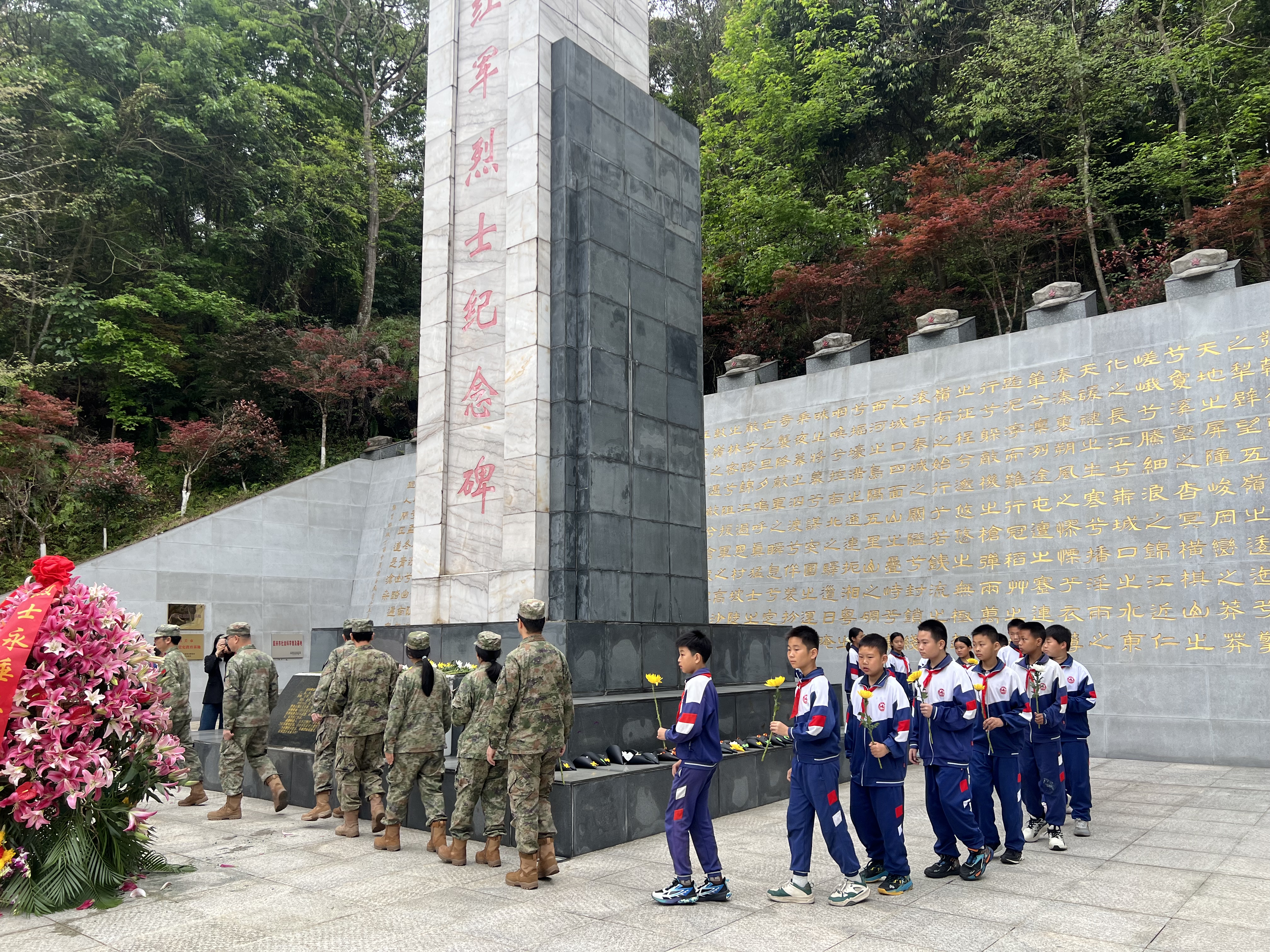 仁化县铜鼓岭红军烈士纪念园为纪念红军长征过境粤北期间在仁化县铜鼓岭阻击战中牺牲的红军烈士而建,纪念园内庄严肃穆。在激昂的国歌声中,活动正式拉开序幕,全体人员整齐列队,向革命烈士纪念碑肃立默哀。仁化县委常委、人武部上校部长林志强,人武部上校政委孙亚东,仁化县民政和退役军人事务局局长叶志琴,城口镇党委书记章俊一同向烈士纪念碑敬献花篮、整理缎带。军地代表与学生代表敬献鲜花,表达对英烈的深切缅怀与崇高敬仰。
