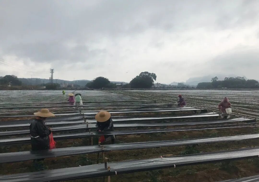 12月18日,在周田镇较坑村稻薯轮种项目种植基地,400多亩的马铃薯苗薄膜即将铺设完成。早在寒潮来临之前,较坑村种植基地就已收到寒潮预警。稻薯轮种项目负责人赖书养提前采购了近50万元的防护膜材料,用于种植片区所有作物的防寒防冻工作。种植现场,大部分的马铃薯苗都覆盖了薄膜,可有效抵御低温霜冻天气对作物生长的不利影响。