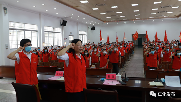 会上,全县十六个创文网格区所有责任单位分管领导和联络员、各镇(街)创文分管领导和联络员、仁化县新时代文明实践中心13支志愿服务大队代表近200余人集体庄严宣誓:“我是一名光荣的仁化县新时代文明实践志愿者,我承诺:尽己所能,不计报酬,帮助他人,服务社会...为仁化创建全国县级文明城市贡献力量!”
